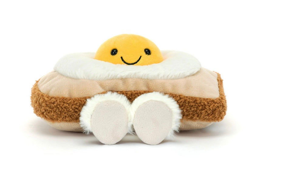 Amuseables Egglantine Egg on Toast is the breakfast of champion cuddlers. A fluffy egg fried sunny side up with bright, smiling yolk sits atop a perfectly toasted slice of bread with textured crust. With fine cord legs and white fluffy slippers, Egglantine starts every day right – from self-care Sundays to meeting Mondays!