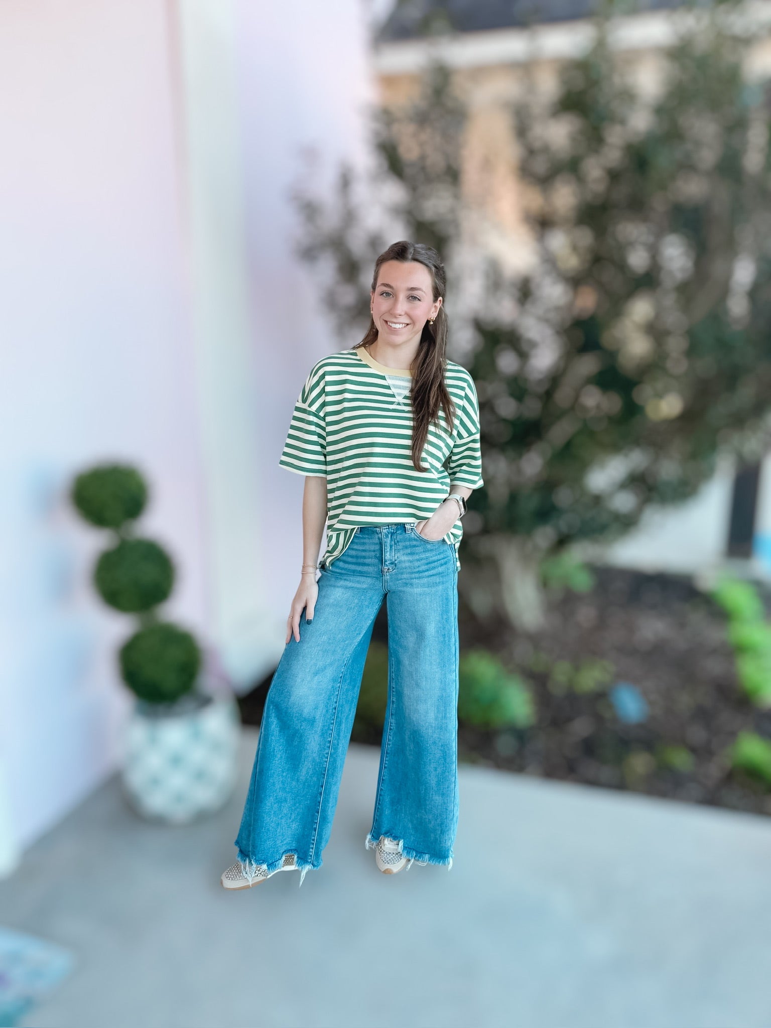 Stripes that pop in green, white, and yellow—this tee brings bold color and laid-back style to your everyday rotation. The Wildcat Stripe Tee is perfect for mixing with your favorite bottoms, whether you're keeping it casual or dressing it up. Comfortable, versatile, and ready to make a statement.
