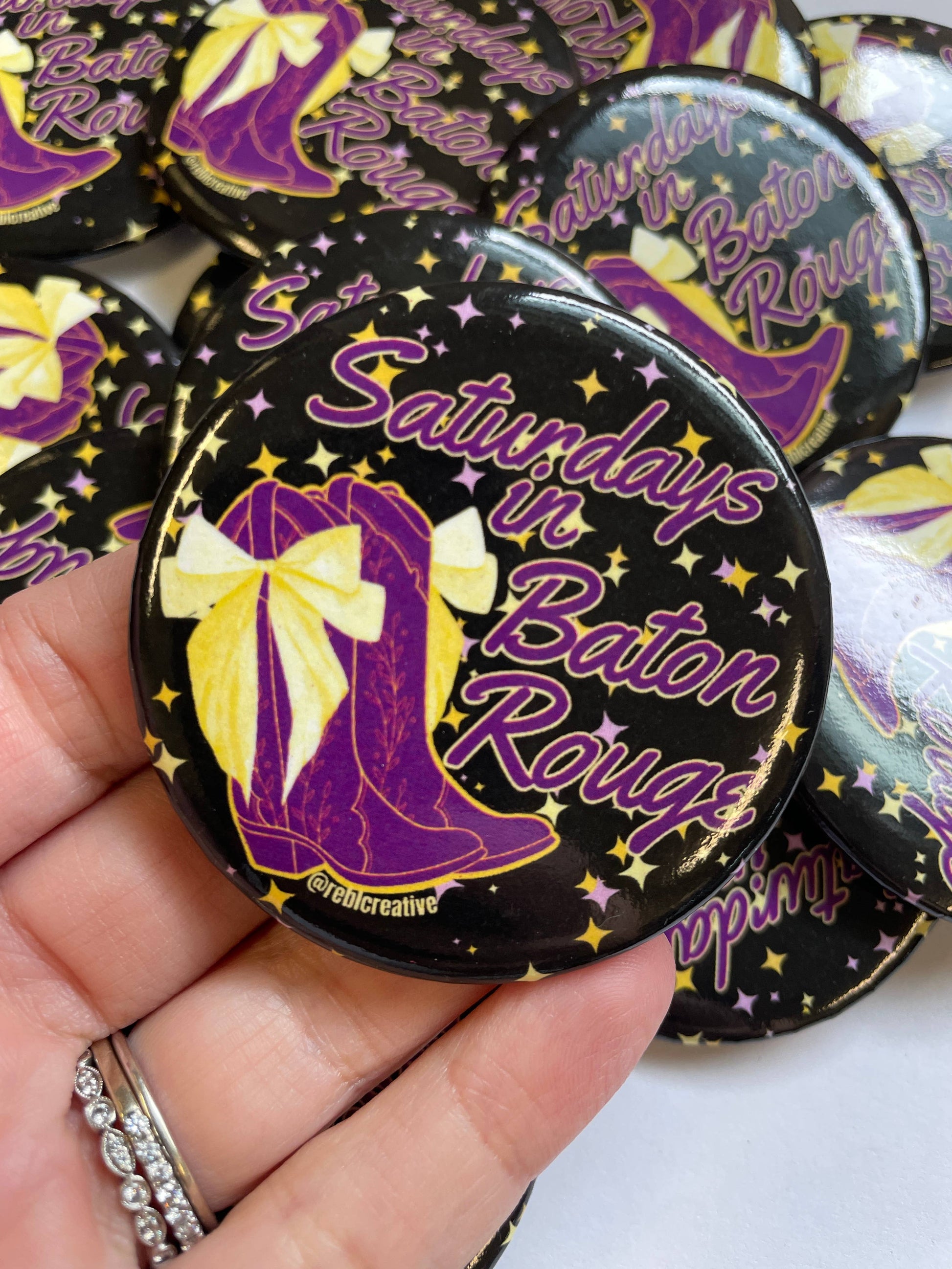 Each pin back button is 2.25 inches in diameter. These buttons are super lightweight and perfect for Game Day! Add to your outfit or a purse strap to complete your game day look. Each button is finished with a plastic coating to keep your button clean from any game day activities!