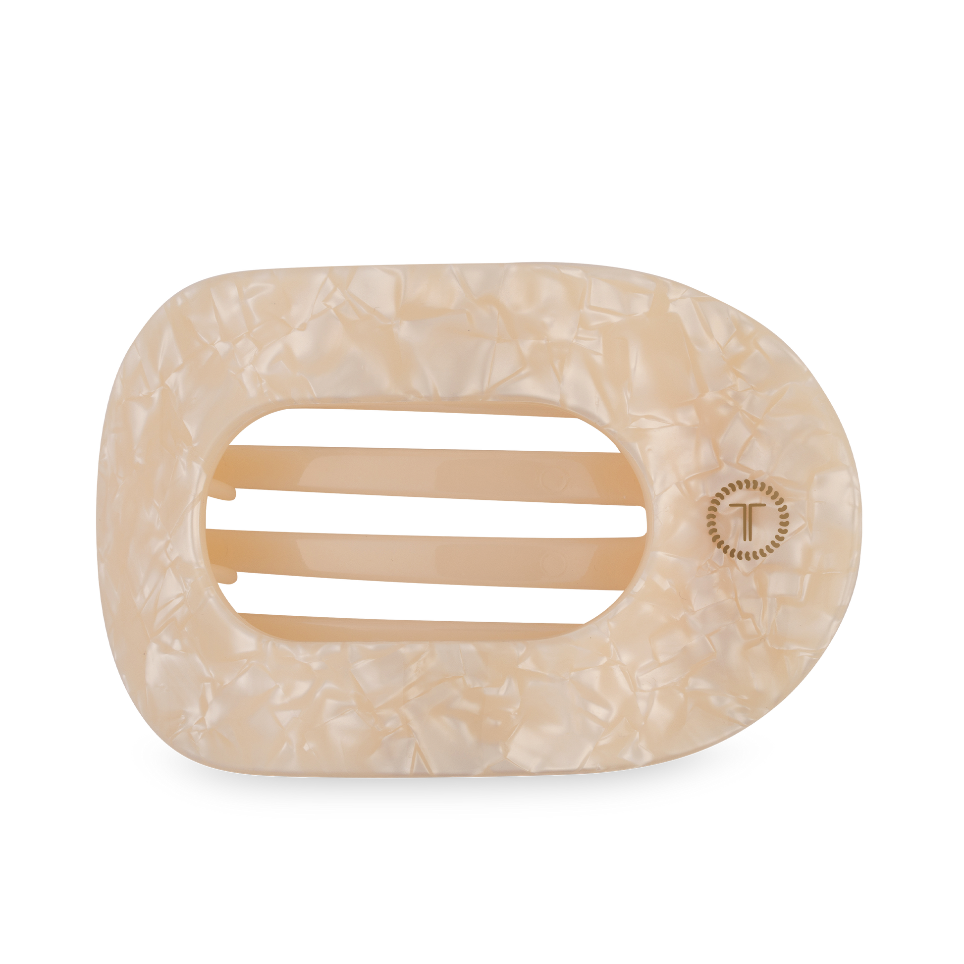 Lay flat and relax with the new TELETIES Soft Surf Large Flat Round Hair Clip in Tan. This hair clip is designed to allow you to lay back flat, do yoga, or sit comfortably in a seat with a headrest, and it is made with the same material that is nearly unbreakable.