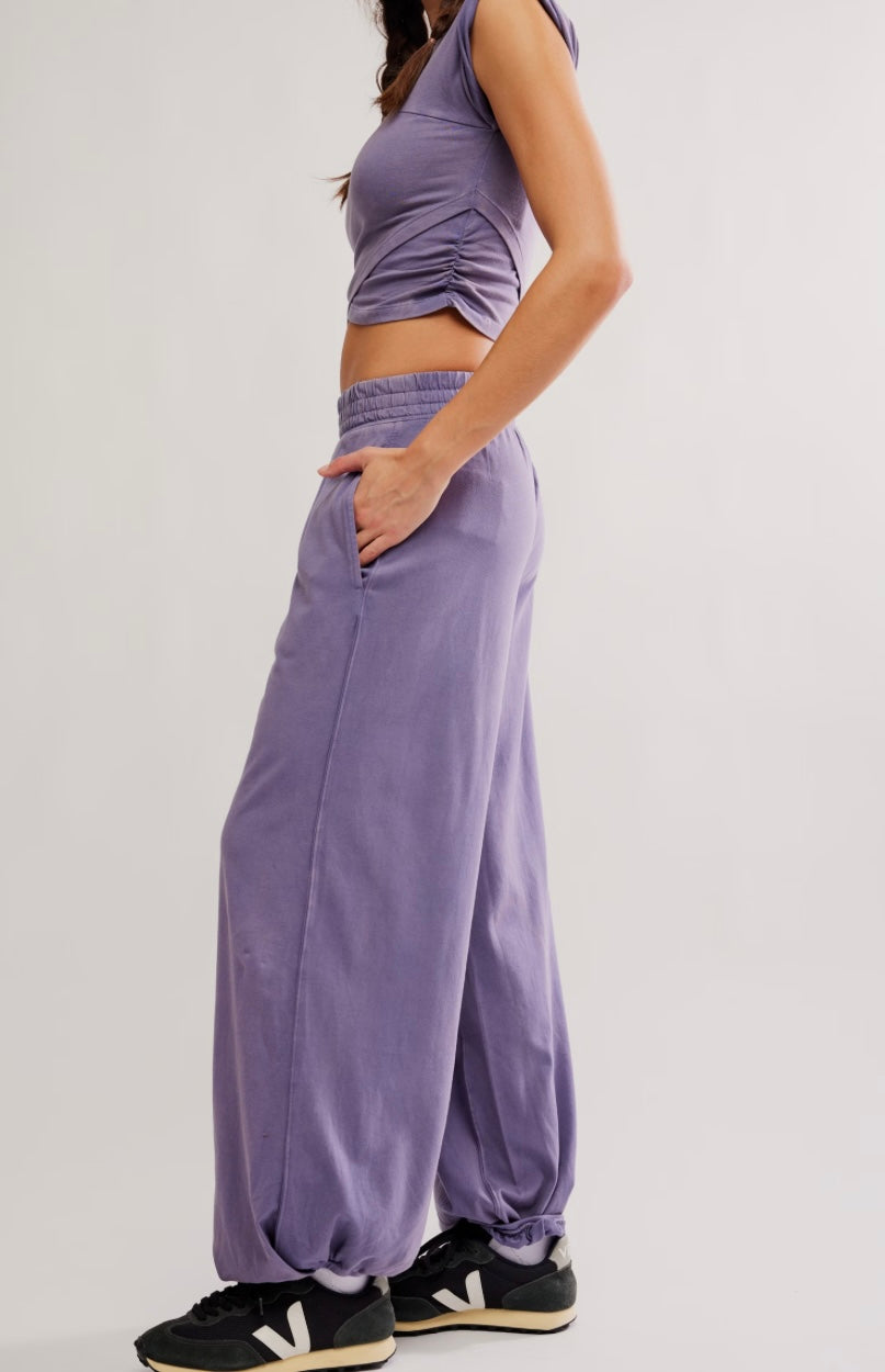 Features: Soft, jersey fabrication; relaxed fit; cropped muscle tee top with seaming detail; ankle length pant with high-rise waist and wide leg; elasticated waistband and cuffs; crossover detail on top; ribbed collar; side seam pockets