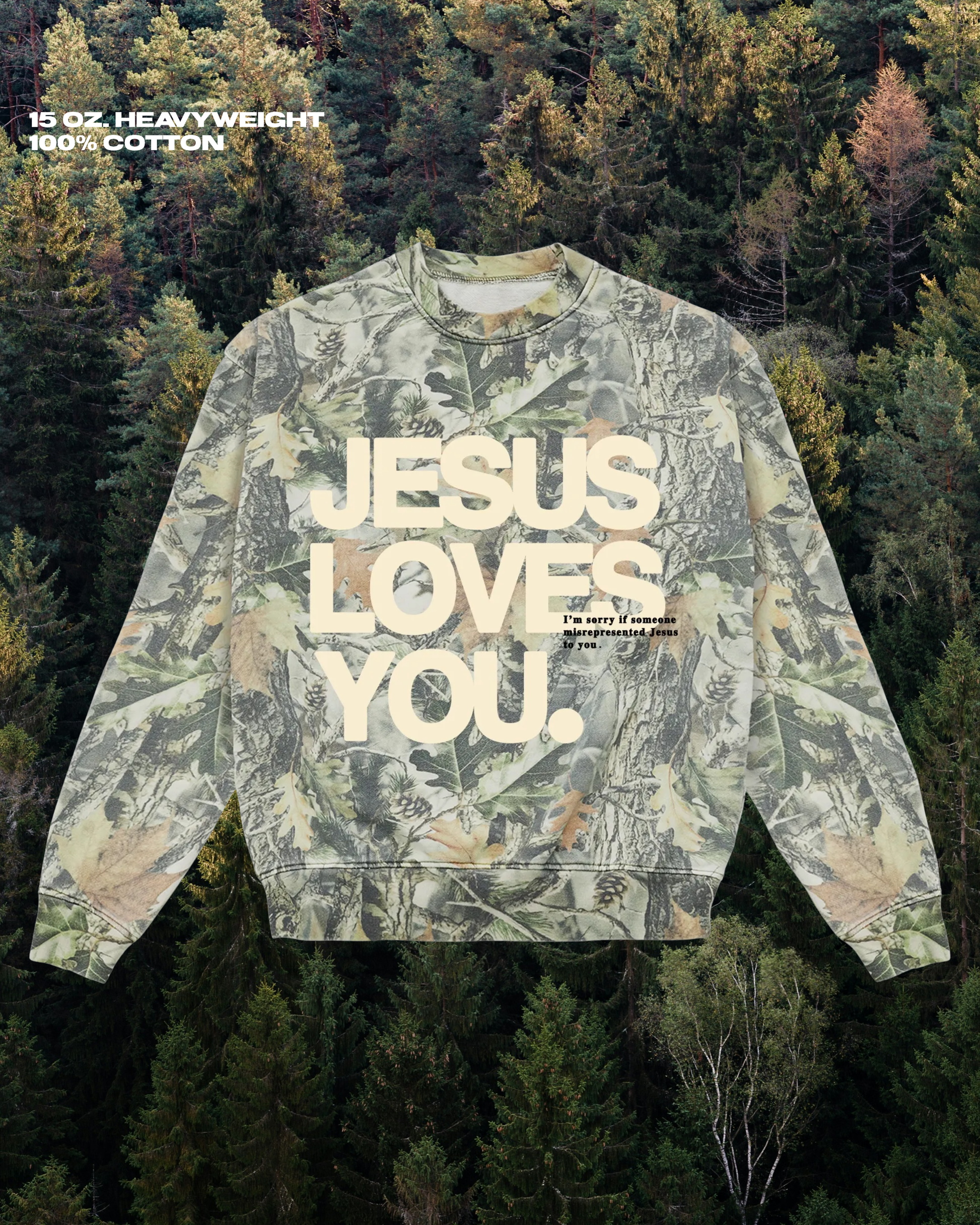 A brand new camo option for you on a premium 15 oz. crewneck with our "Jesus Loves You" design printed full size on the front.