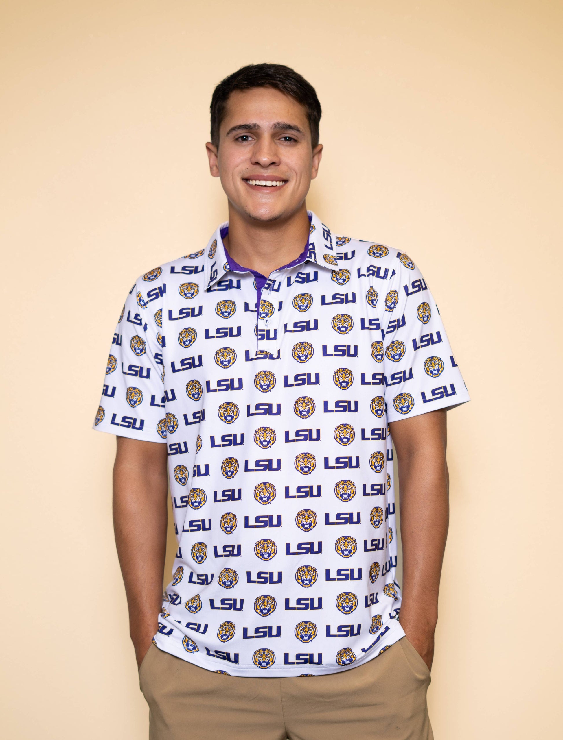 Men's Polo (White) OFFICIALLY LICENSED BY LOUISIANA STATE UNIVERSITY. The indicia featured on this product are trademarks of Louisiana State University. Get ready for nights in Death Valley in our OFFICIALLY LICENSED Men's Polo featuring iconic LSU Logos. Material: 92% Polyester/8% Spandex Size Chart available for size reference in the images.