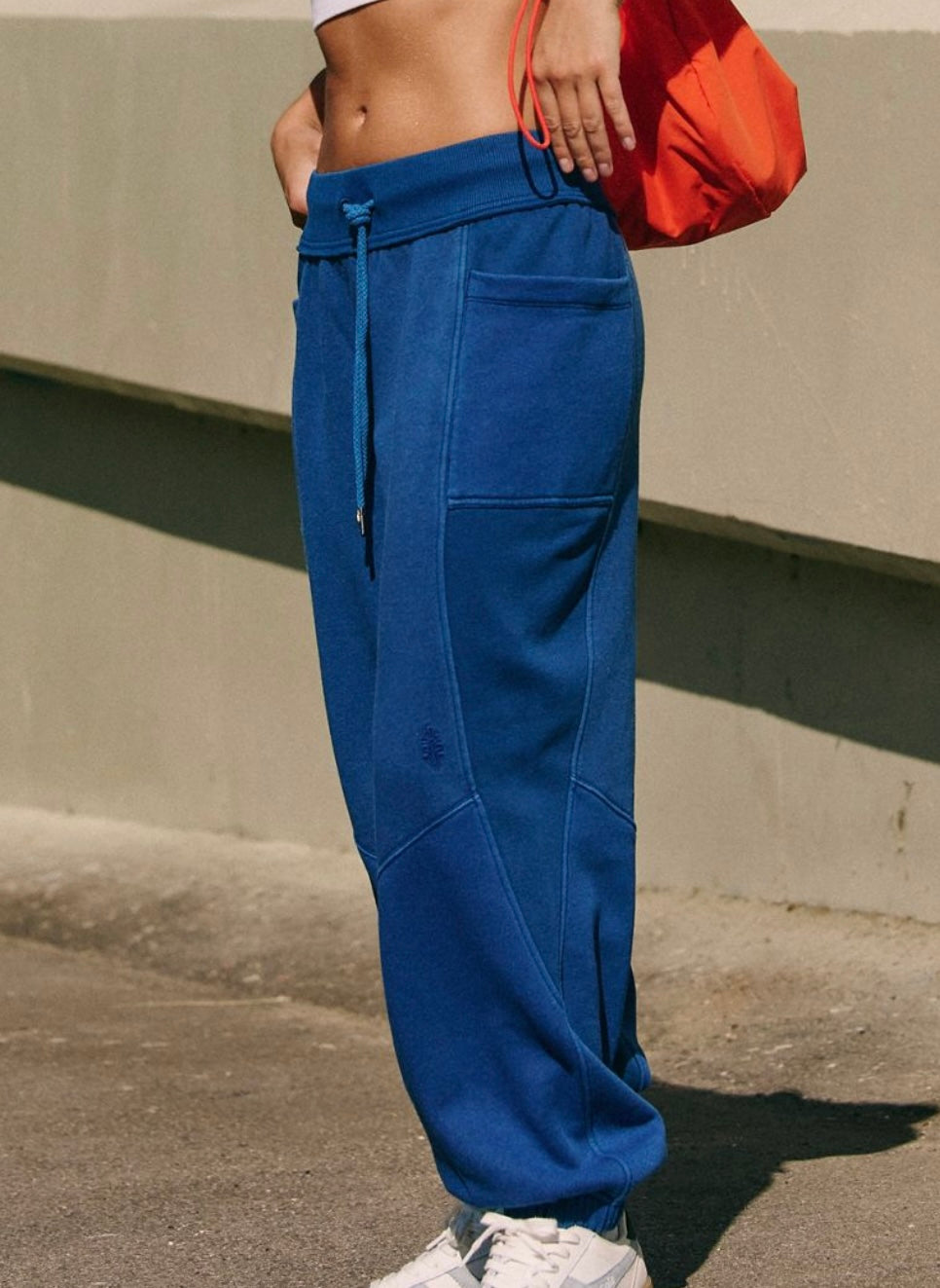 Features: Low-rise style; drawstring detail at waistband; elasticated ankles; side pockets