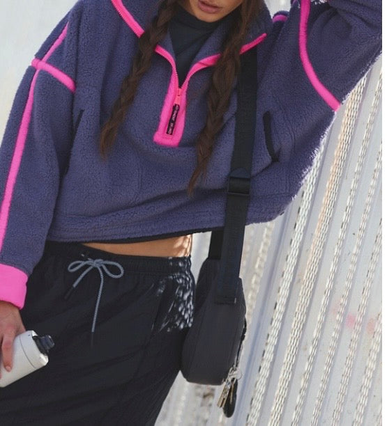 Cozy fleece pullover featuring a half-zip closure and high neckline with bold contrast seams throughout and an adjustable hemline.