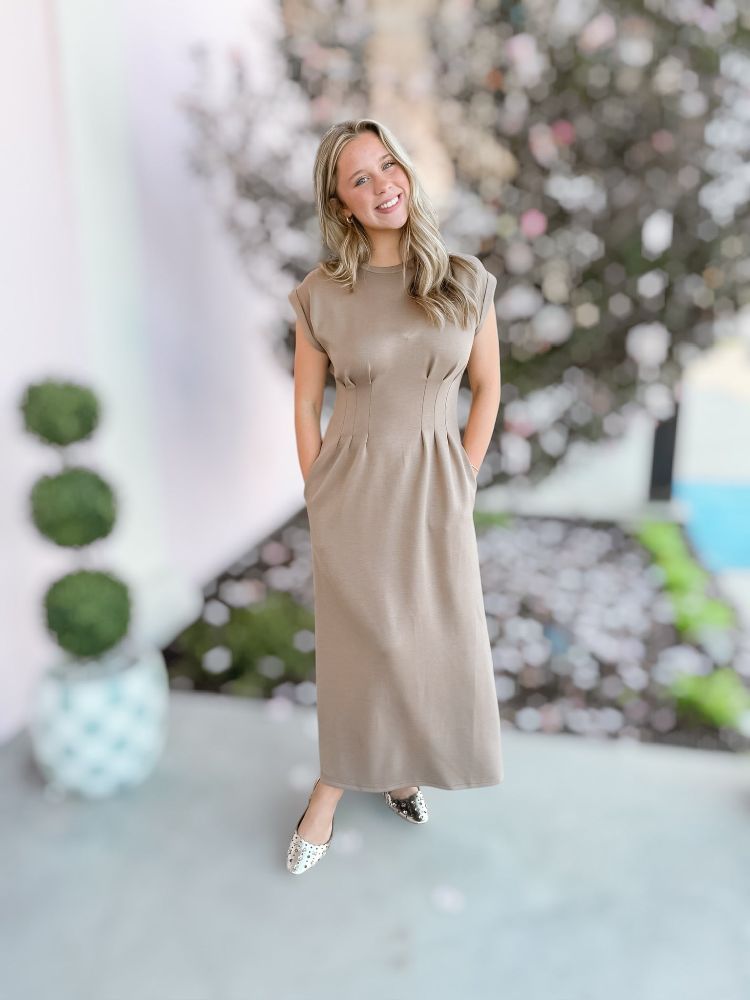 Solid cap sleeve midi dress featuring round neckline, front and back pleated bodice, side pockets. Unlined. Knit. Non-sheer. Lightweight.