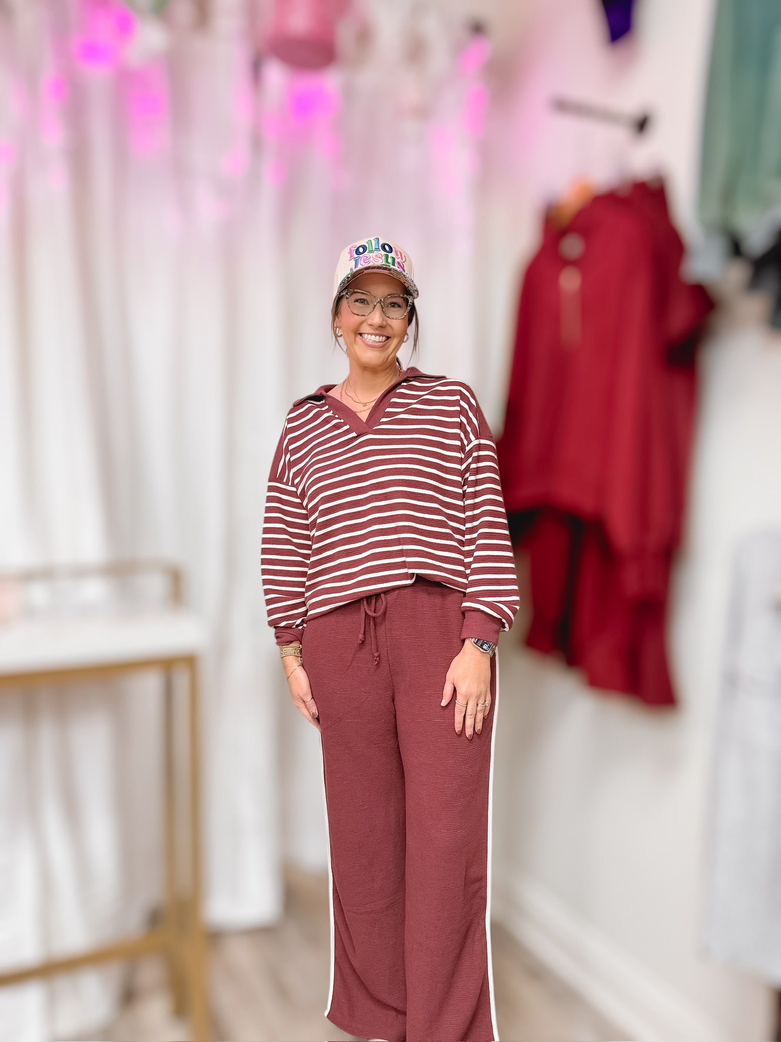 Wine Cloud 9 Contrast Line Straight Pants With Drawstring Waist