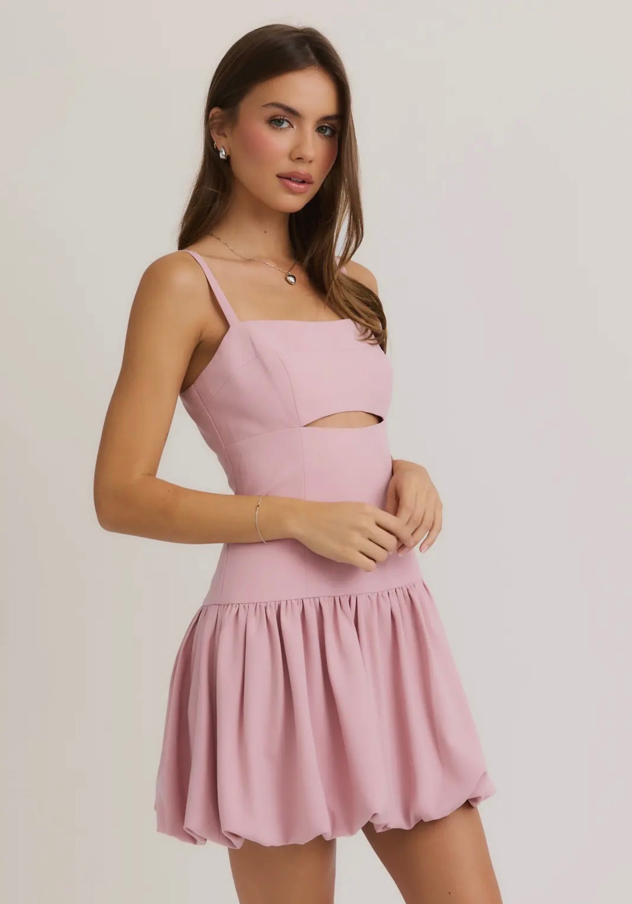 Up & Away Pink Balloon Skirt with Front Cut Out Mini Dress