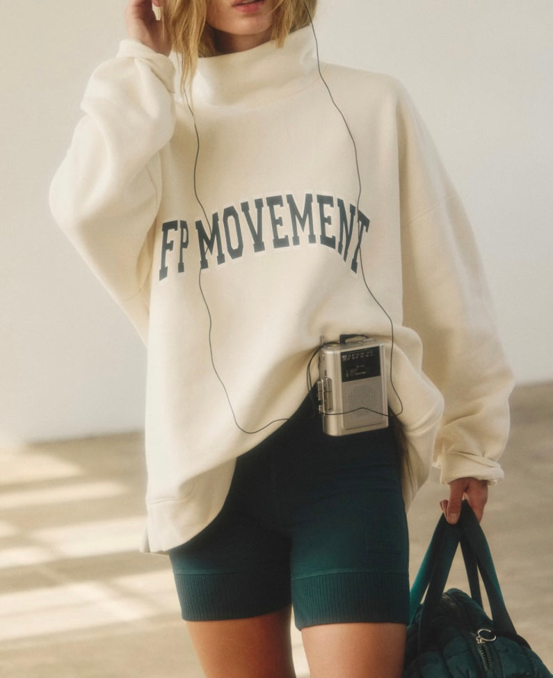 Features: Pullover; Funnel neckline, dropped shoulder seams, collegiate FP Movement logo at the front; Shorts: Pull-on design, ribbed trimming, mid-thigh length, stretch fit