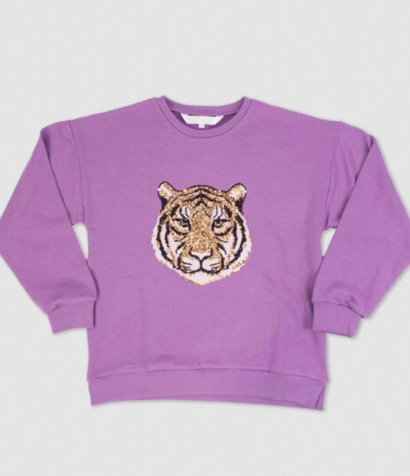 Let their spirit shine in this Youth Tiger Face Sequin Sweatshirt! Featuring a bold tiger face in shimmering sequins and team-inspired colors, it’s the perfect blend of playful and fierce for game days, school spirit, or just everyday fun.
